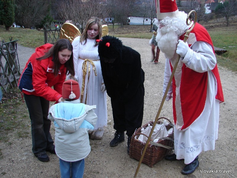 Okolo Mikulášovej osoby sa zachovalo najviac zvykov súvisiacich s jeho obdarovaním všetkých detí. V predvečer sviatku navštevuje muž s bielou bradou deti a nadeľuje im sladkosti, ale ich aj dobrotivo karhá. Prv mal Mikuláš aj početný sprievod, ktorý tvorili maskované postavy, neskôr sa zredukovali na anjela a čertov. Mikuláš si obliekal tradičný odev biskupa, ktorý pozostával z plášťa s kapucou lemovaného kožušinou, na hlave mal vysokú papierovú čiapku a v ruke berlu. Anjeli mali biele košele a čert si natiahol obvykle dlhý, čiernou srsťou von obrátený kožuch, prepásaný reťazou a na nej zvonce. Deti si pred nimi museli kľaknúť a modliť sa :